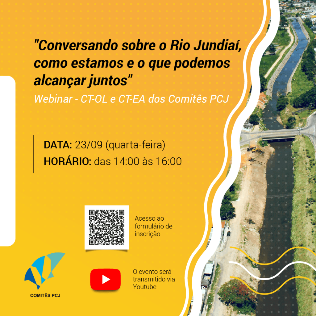 A Câmara Técnica de Outorgas e Licenças (CT-OL) dos Comitês PCJ e o seu Grupo de Trabalho de Enquadramento dos Corpos d’água realizarão, em 23/09/2024, às 14:00 horas, o 5º Webinário “Conversando sobre o Rio Jundiaí, com o tema “Nosso papel na despoluição”.