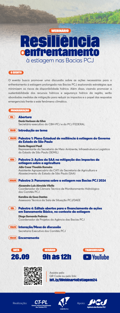 A Câmara Técnica de Planejamento (CT-PL) dos Comitês PCJ realizará, em 26/09/2024, das 9h00 às 12h00, o Webinário “Resiliência e enfrentamento à Estiagem nas Bacias PCJ” para promover discussões sobre as ações necessárias para o enfrentamento à estiagem prolongada nas Bacias PCJ, explorando estratégias que minimizem os riscos de disponibilidade hídrica.