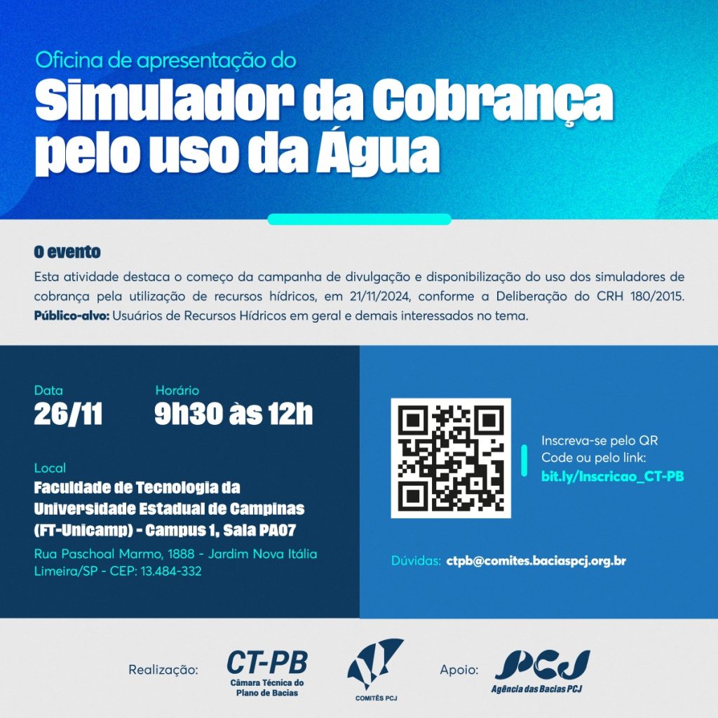 Câmara Técnica do Plano de Bacias (CT-PB) dos Comitês PCJ realizará em 26/11/24, das 9:30 às 12:00 horas, o evento presencial, “Oficina de apresentação do Simulador da Cobrança pelo uso da Água”.