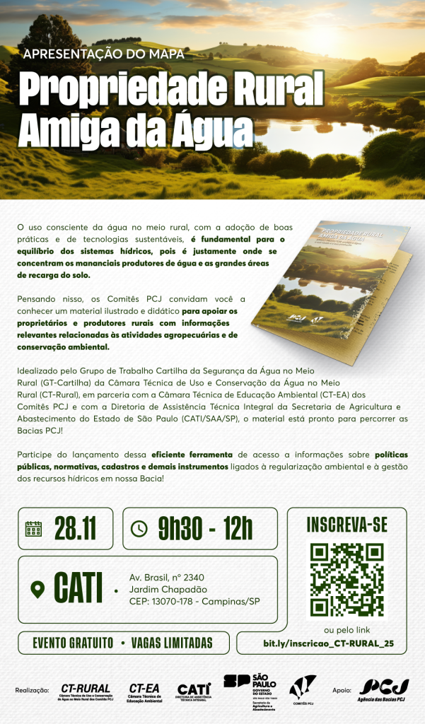 A Câmara Técnica de Uso e Conservação de Água no Meio Rural (CT-Rural) dos Comitês PCJ, em parceria com a Câmara Técnica de Educação Ambiental (CT-EA) dos Comitês PCJ e com a Diretoria de Assistência Técnica Integral da Secretaria de Agricultura e Abastecimento do Estado de São Paulo (CATI/SAA/SP) realizará, em 28/11, das 9:30 às 12:00 horas, na CATI, em Campinas/SP, a apresentação do Mapa “Propriedade Rural Amiga da Água”.